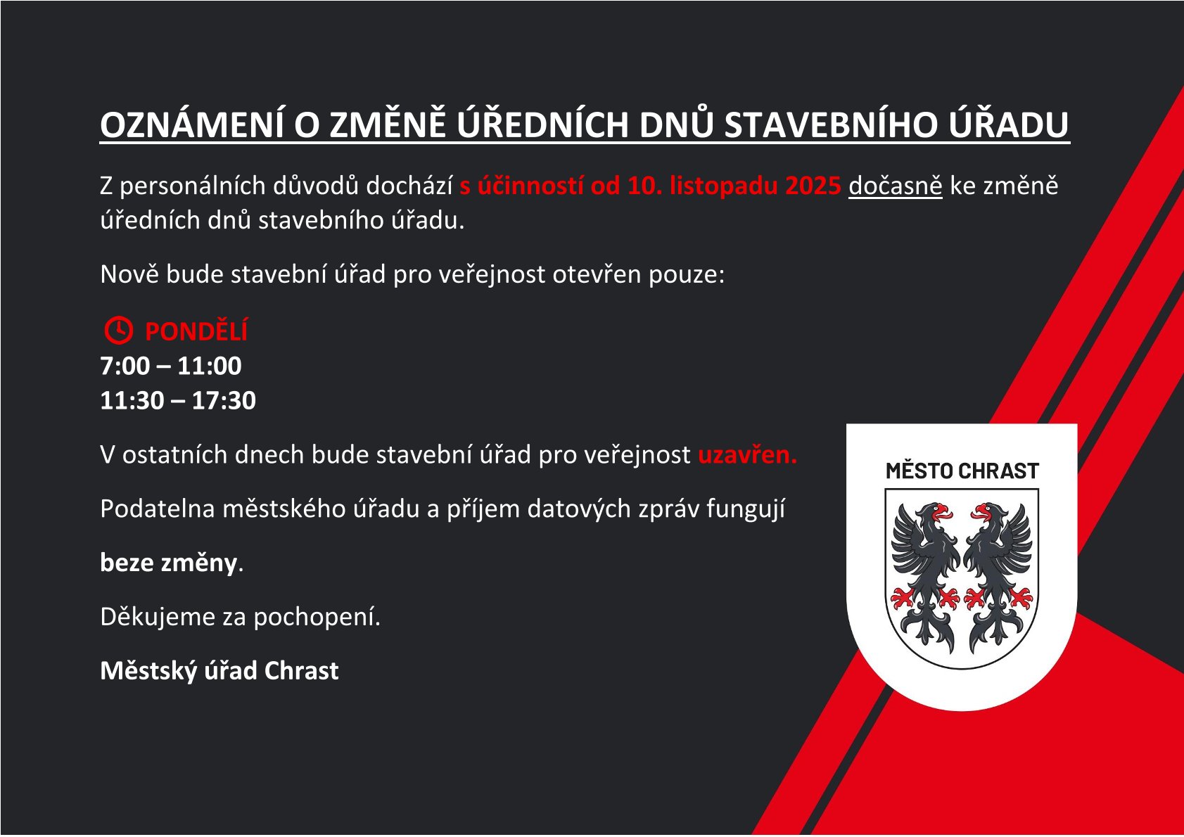MÚ CHRAST - OZNÁMENÍ O ZMĚNĚ ÚŘEDNÍCH DNŮ STAVEBNÍHO ÚŘADU [ARCHIV]